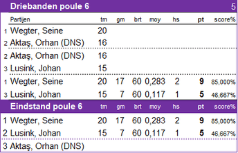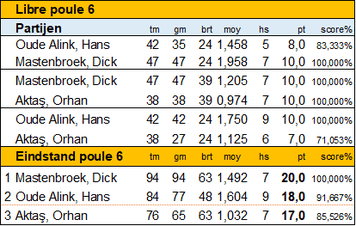 Libre : 2 poules van 4. Driebanden: 2 poules van 4