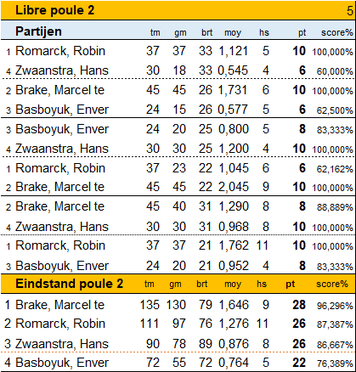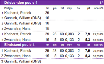 Libre : 4 poules van 3. Driebanden: 4 poules van 3