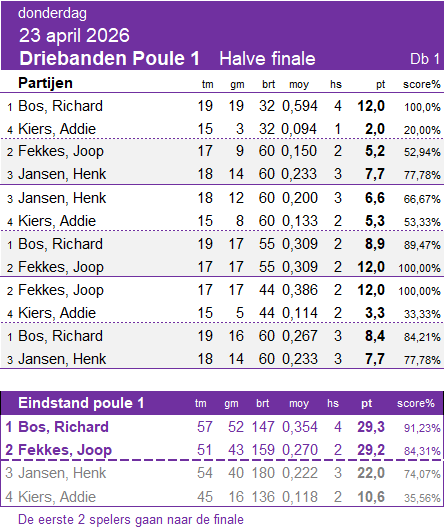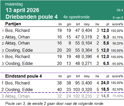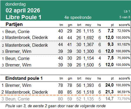 2 poules van 4 Libre en 2 poules van 4 Driebanden